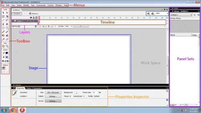 Znajdziesz panele do zarządzania wszystkimi funkcjami animacji osi czasu, zasobami biblioteki i ustawieniami właściwości. Oś czasu może być używana do tworzenia i edycji grafiki wektorowej, animowania obiektów oraz publikowania utworzonych treści w postaci pliku SWF do wdrożenia w internecie.